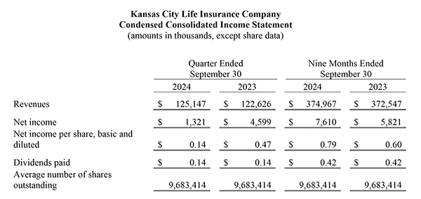 Kansas City, MO. Kansas City Life Insurance Company recorded net income of $1.3 million or $0.14 per share in the third quarter of 2024, down from net income of $4.6 million or $0.47 per share in the third quarter of 2023. Net income totaled $7.6 million or $0.79 per share in the first nine months of 2024, up from $5.8 million or $0.60 per share in the first nine months of 2023.