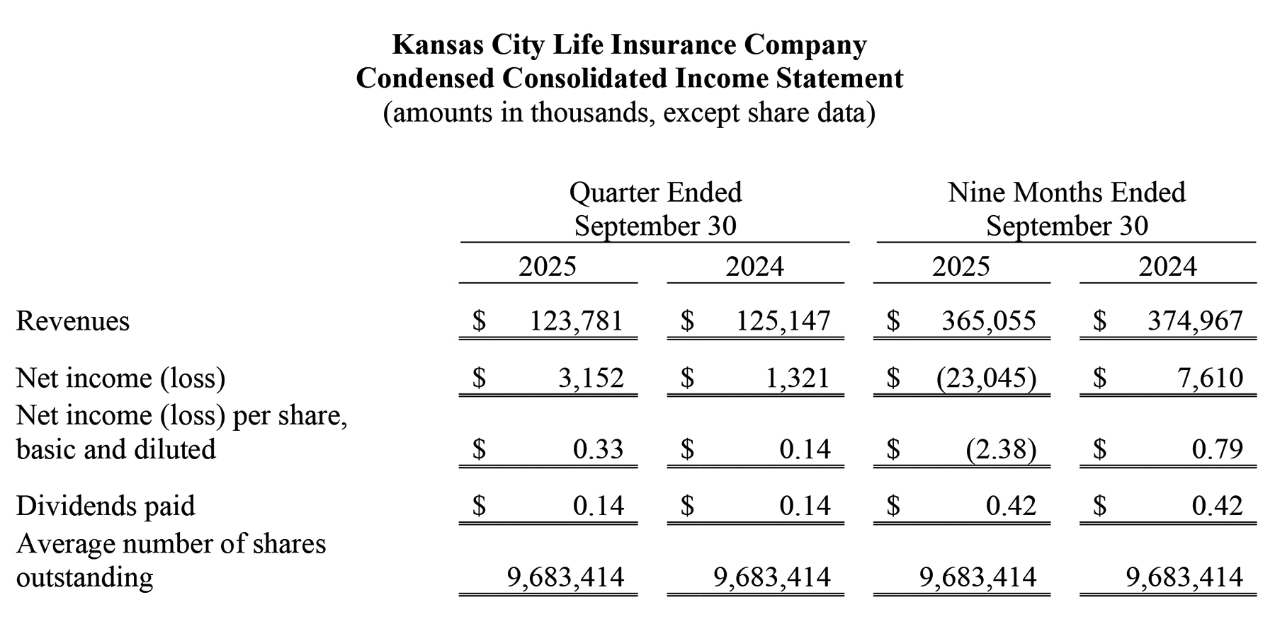 Kansas City, MO. Kansas City Life Insurance Company recorded net income of $3.2 million or $0.33 per share in the third quarter of 2025, up from net income of $1.3 million or $0.14 per share in the third quarter of 2024. The improvement in net income in the third quarter of 2025 reflected higher investment revenues and lower policyholder benefits, which was largely driven by a decline in death benefits, net of reinsurance. These improvements were partially offset by a decrease in insurance revenues. We recorded a net loss of $23.0 million or $2.38 per share in the first nine months of 2025 compared to net income of $7.6 million or $0.79 per share in the first nine months of 2024. The primary factor in the decrease in net income in the first nine months of 2025 was the establishment of a legal settlement accrual of $35.5 million, net of tax, in the second quarter related to a potential settlement of class action lawsuits. Excluding this legal settlement accrual, net income would have been $12.5 million or $1.29 per share in the first nine months of 2025. After excluding the legal settlement accrual, the increase over the first nine months of 2024 was primarily due to lower policyholder benefits. Partially offsetting this was a decrease in insurance revenues. Kansas City Life Insurance Company (OTCQX: KCLI) was established in 1895 and is based in Kansas City, Missouri. The Company's primary business is providing financial protection through the sale of life insurance and annuities. The Company operates in 49 states and the District of Columbia. For more information, please visit www.kclife.com.
