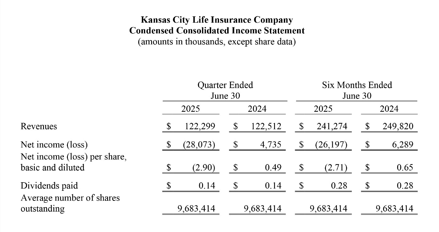 Kansas City, MO. Kansas City Life Insurance Company recorded a net loss of $28.1 million or $2.90 per share in the second quarter of 2025 compared to net income of $4.7 million or $0.49 per share in the second quarter of 2024. The primary factor in the decrease in net income in the second quarter of 2025 was the establishment of a legal settlement accrual of $35.5 million, net of tax, related to a potential settlement of class action lawsuits.